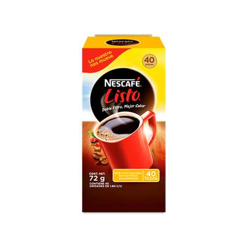 Presentacion Caja tipo display, tipo soluble, contiene 60 sobres de 1.8 grs. Practico y facil de lllevar a todos lados, aroma y sabor en tu bolsillo.